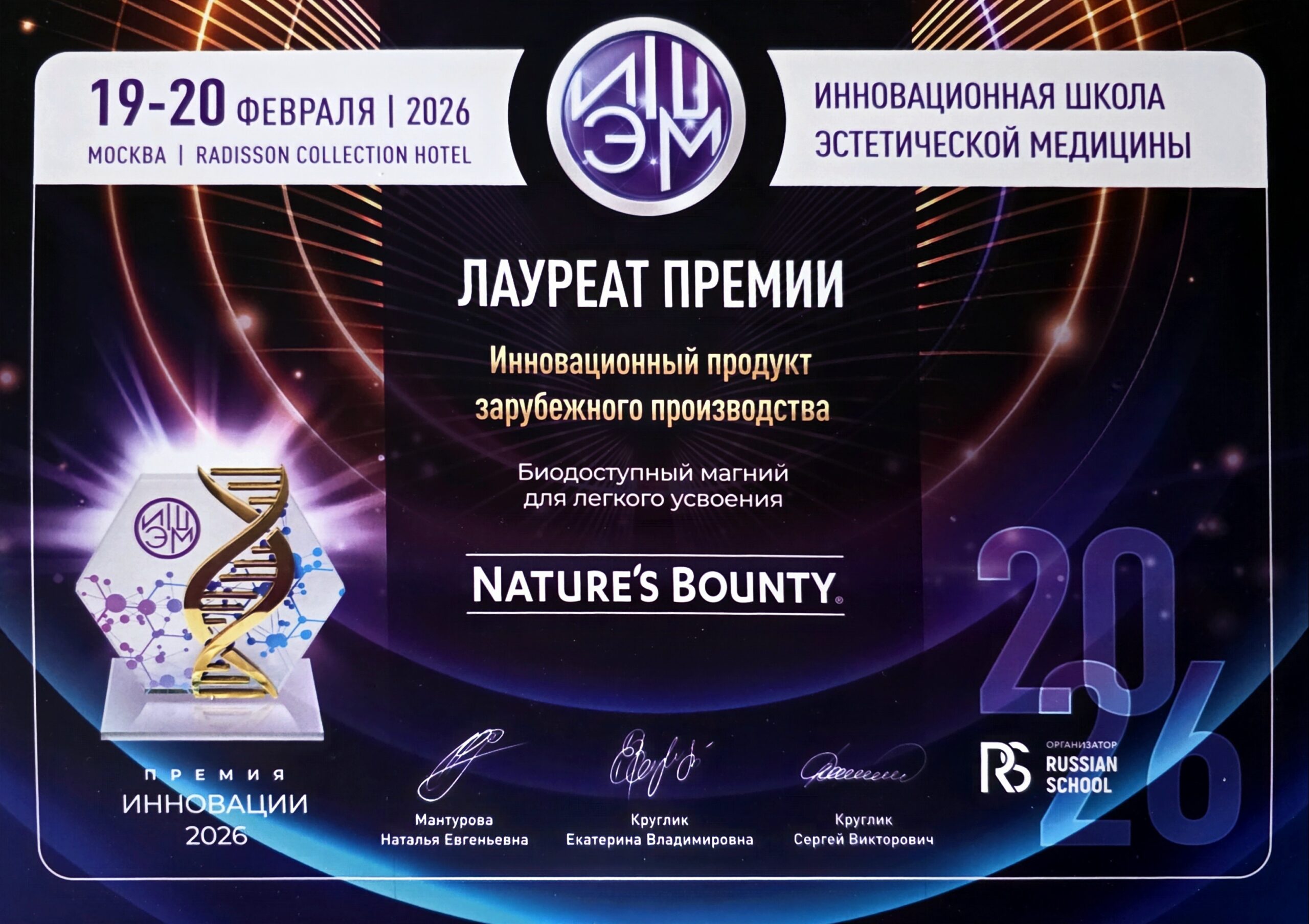 В 2026 году, в рамках ИШЭМ, продукт «Глицинат магния» Nature’s Bounty (Нэйчес Баунти) стал лауреатом Национальной премии “Инновации 2026” в номинации ‘Инновационный продукт зарубежного производства’!